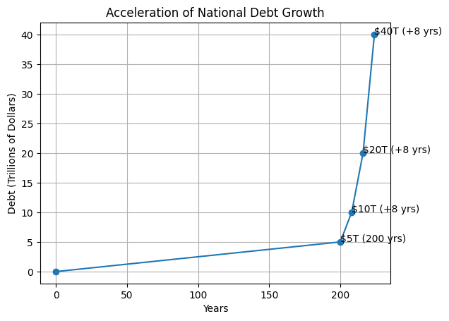 It took 200 years to accumulate $5 trillion in national debt. It doubled under President George W Bush from $5 to $10 trillion, and doubled again from $10 to $20 under President Obama. Its doubled once again over the last 8 years and is now about to cross the $40 trillion mark.